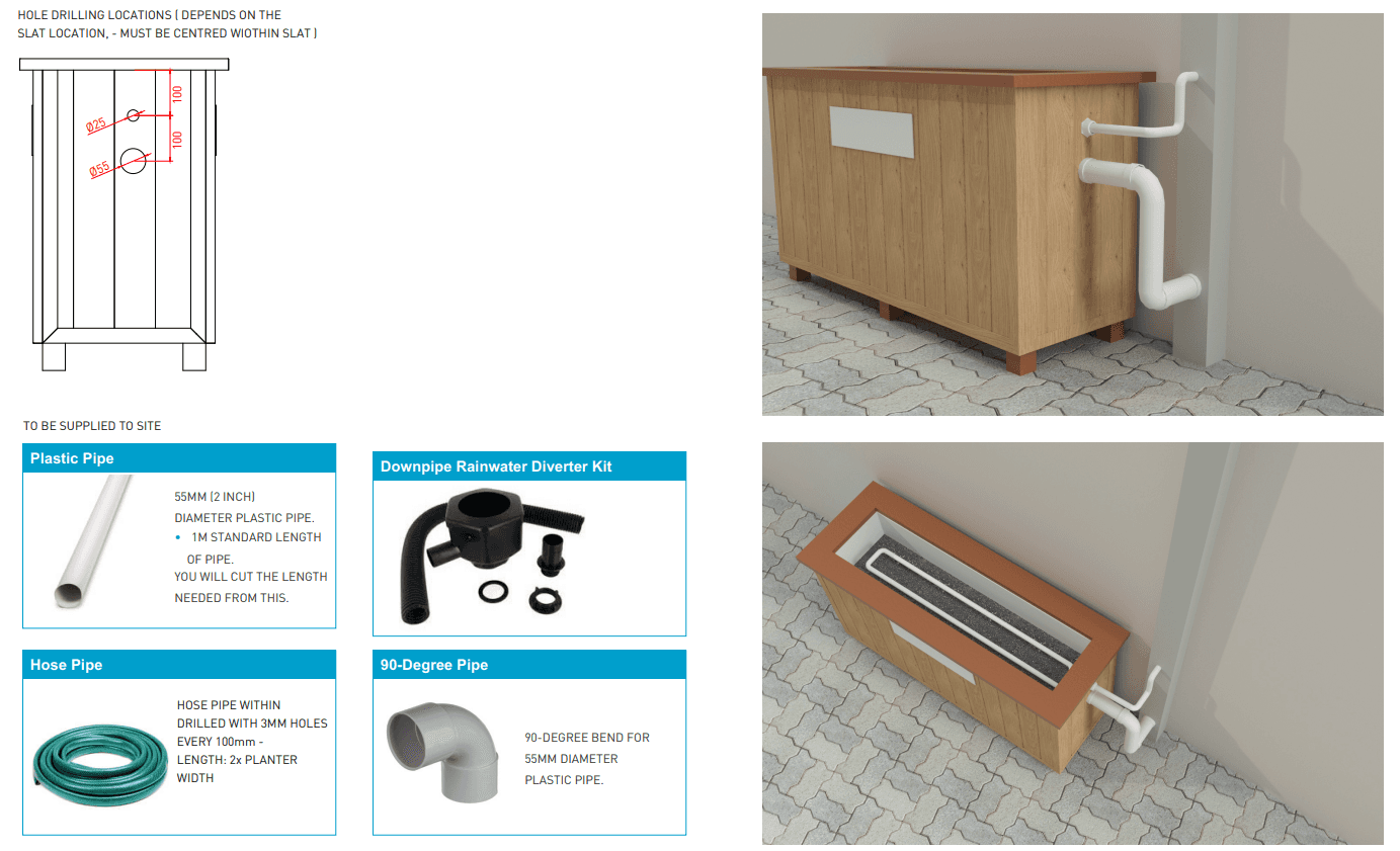 Zastosowano system rur i złączy o średnicy 55 mm, z elastycznym przewodem i zestawem dyfuzorów rozprowadzających wodę wewnątrz donicy.