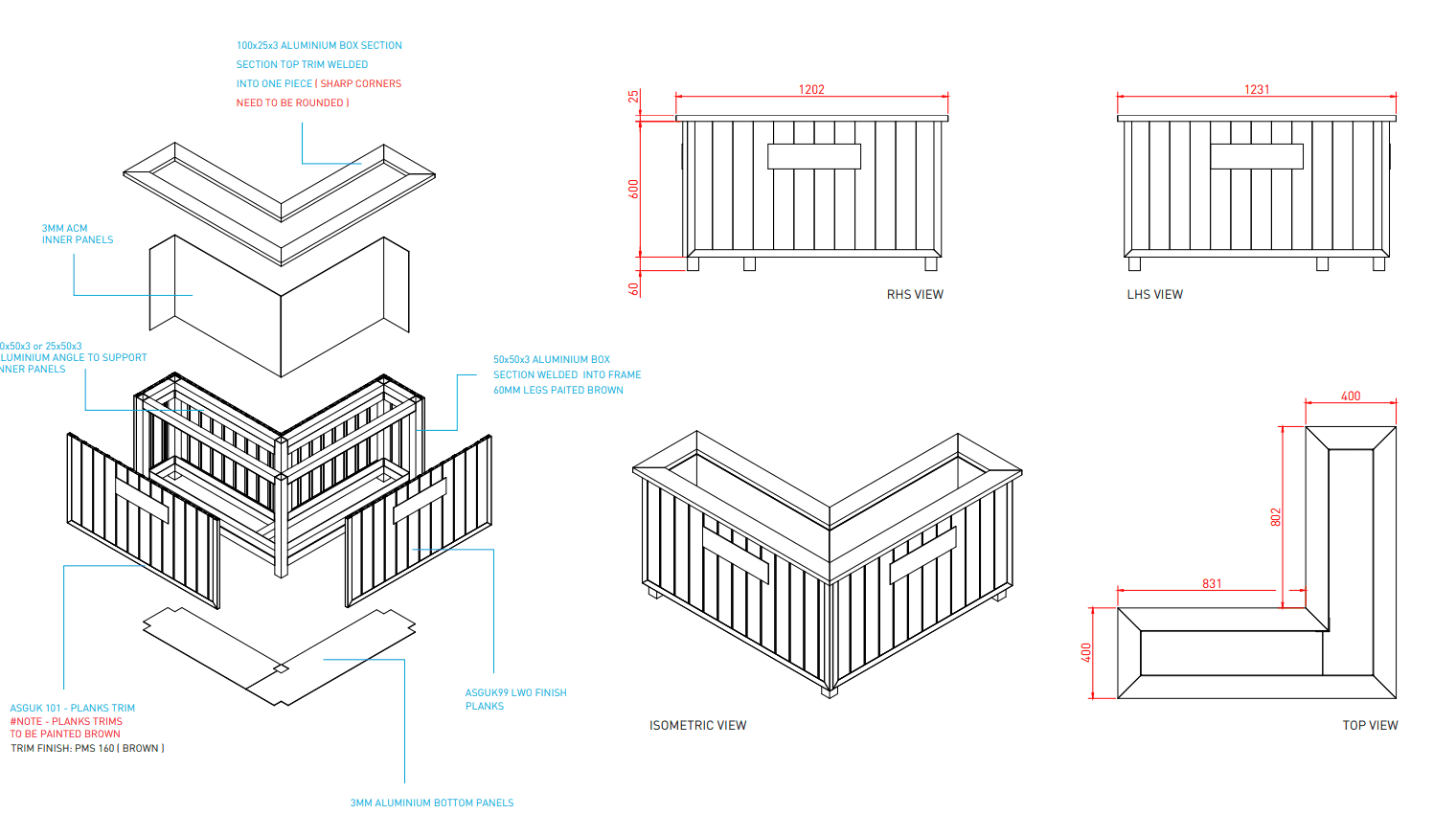 Korpus wykonano z profili aluminiowych 50×50×3 mm, paneli ACM 3 mm oraz okładzin imitujących drewno w kolorze Light Winchester Oak. Całość uzupełniają detale lakierowane proszkowo w odcieniu PMS 160 Brown, co nadaje projektowi ciepły i naturalny charakter.