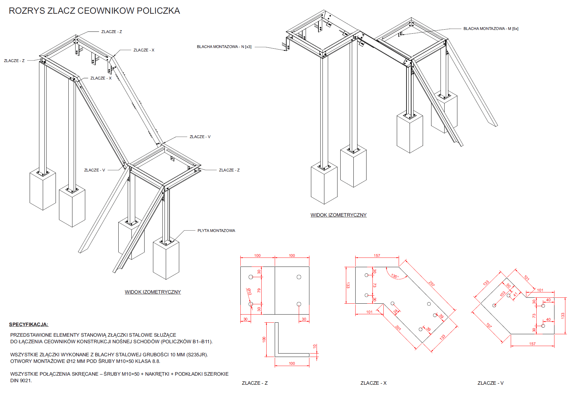 Zakres: Rysunki techniczne, detale połączeń, płyty bazowe, balustrady, tralki