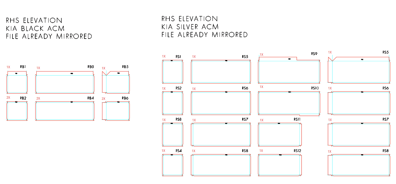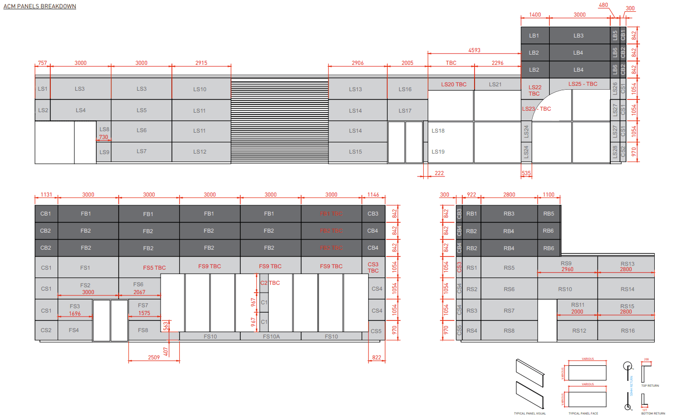 Zakres obejmował modelowanie konstrukcji nośnej, opracowanie podziału paneli aluminiowo-kompozytowych (ACM) w dwóch odcieniach — czarnym i srebrnym — oraz przygotowanie pełnego zestawu dokumentacji produkcyjnej i montażowej.