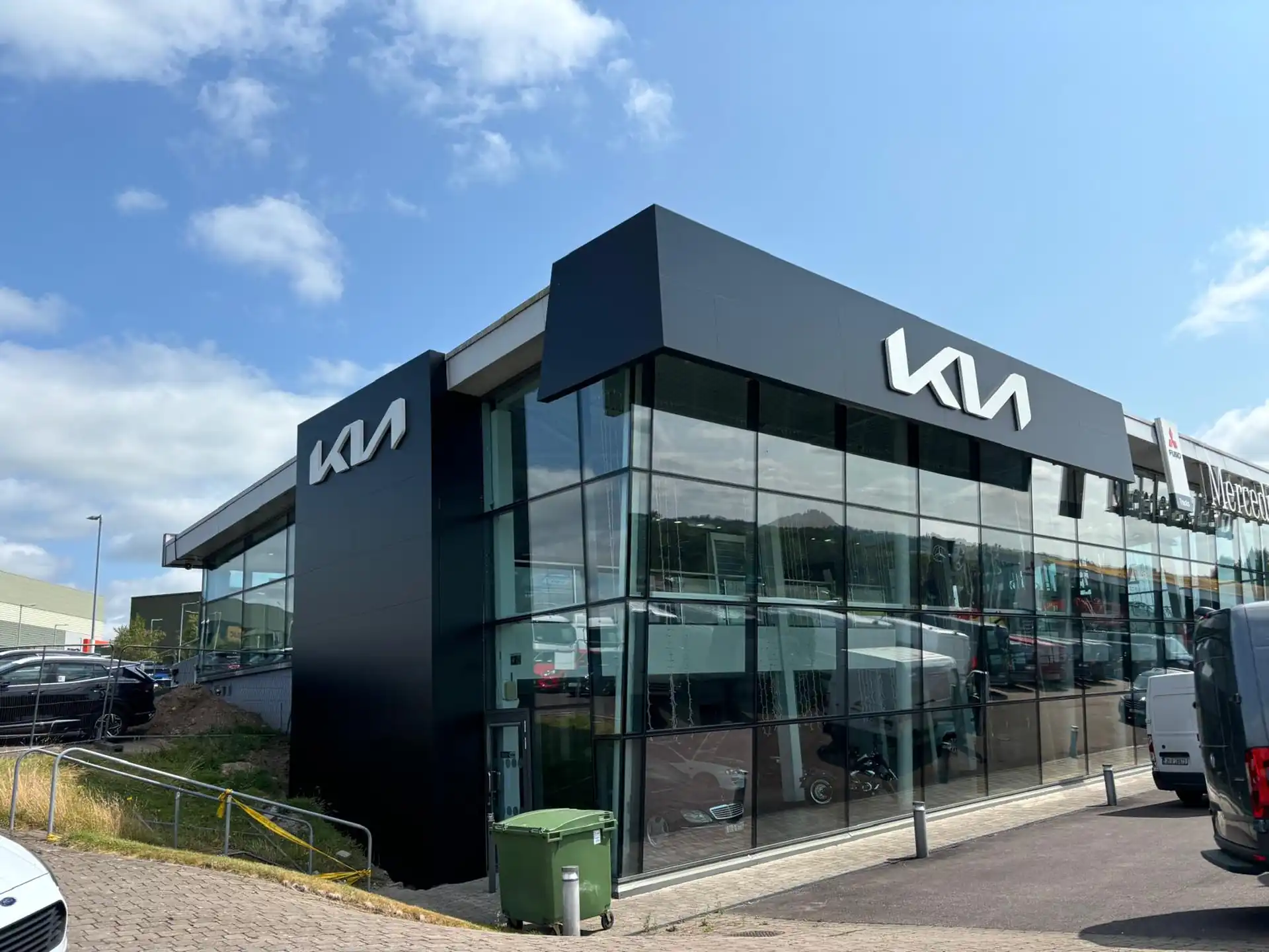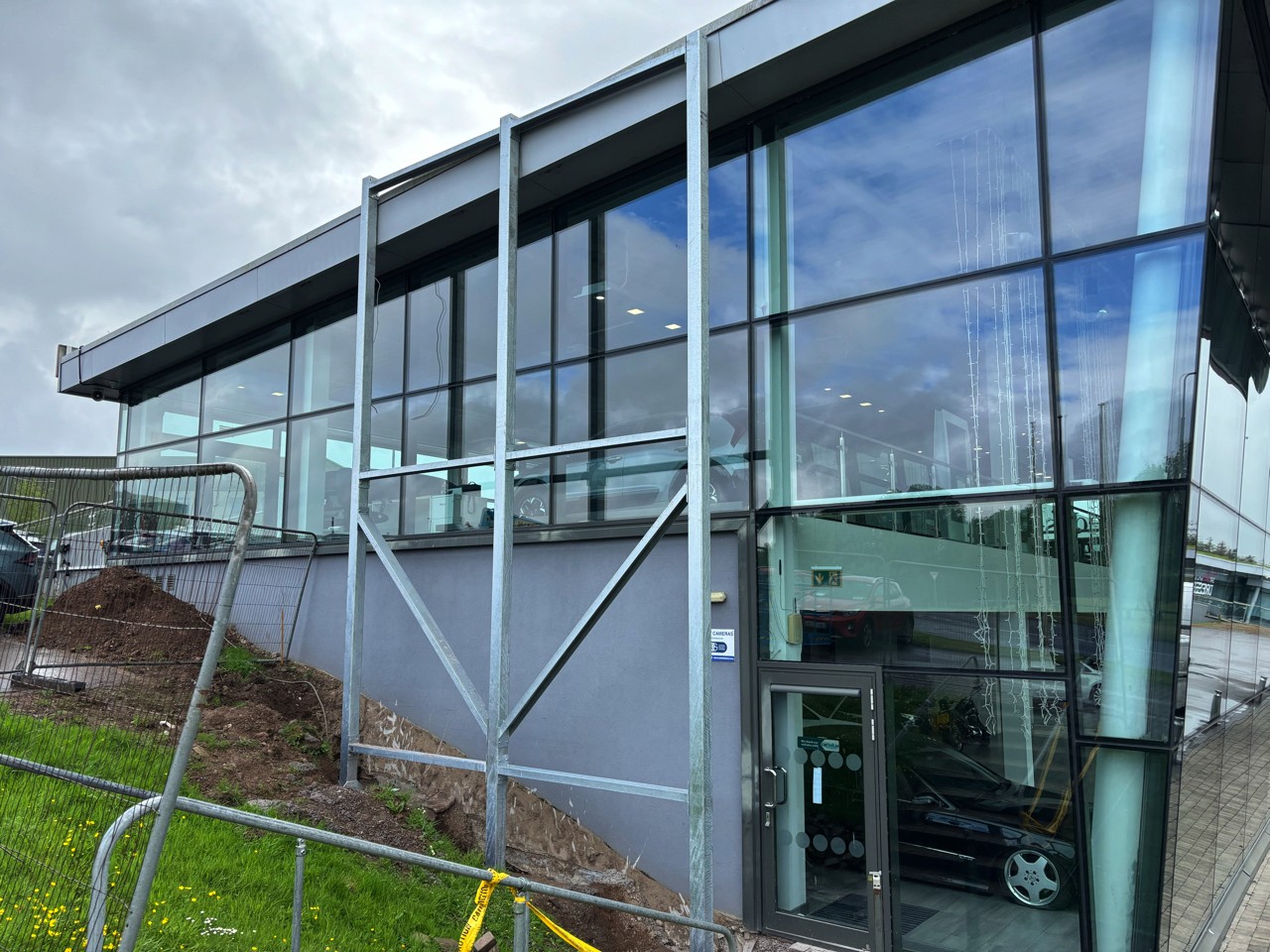 Kompleksowy proces projektowy – od fundamentów przez konstrukcję stalową po finalny cladding z paneli ACM, opracowany w ramach systemu signage dla obiektu z branży automotive.