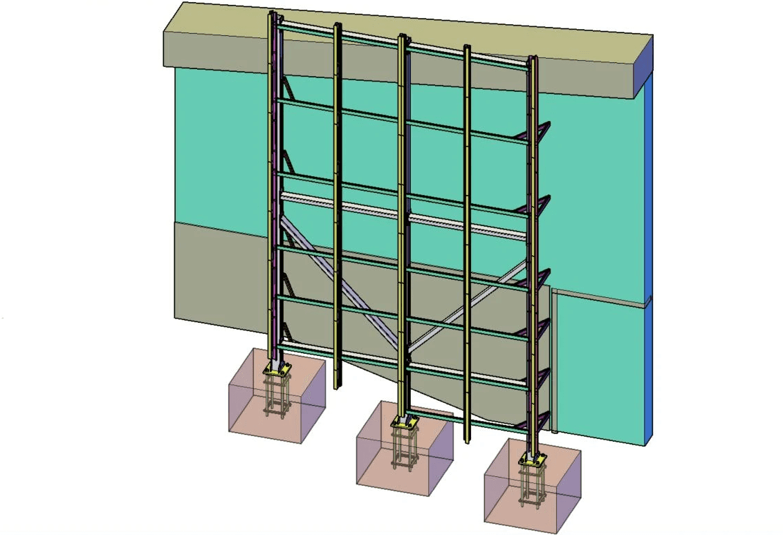 Po przygotowaniu fundamentów opracowano kompletny model stalowej struktury nośnej, pełniącej rolę bazy pod cladding.
